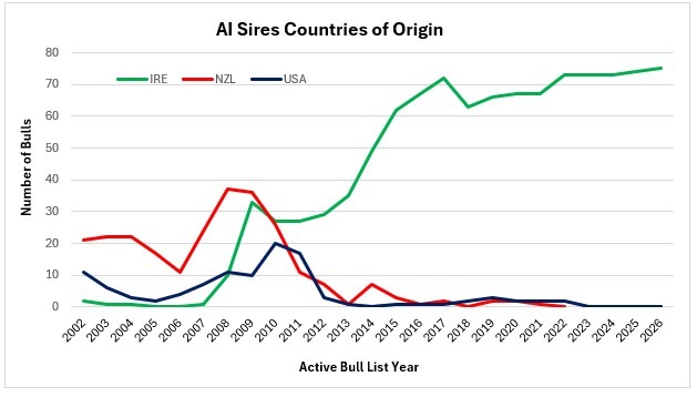 Table 1:  The countries of origin of the top 75 bulls on the Spring Active Bull list (2011-2026).