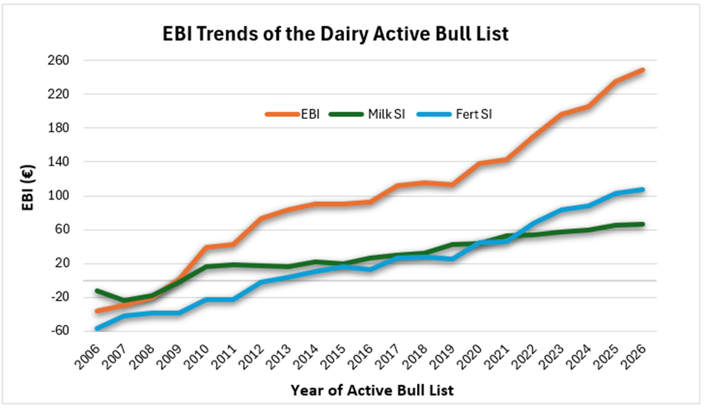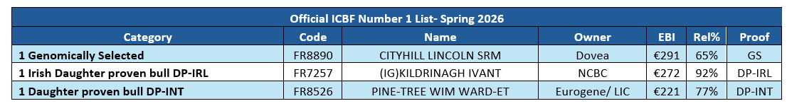 The EBI details of the top 75 bulls on the dairy active bull list are based on the March 2026 genetic evaluations calculated by ICBF. Semen from all of the Bulls has been indicated as being available by the various AI Companies, hence the term ‘Active’ Bull List.  The criteria for making the list are as follows: