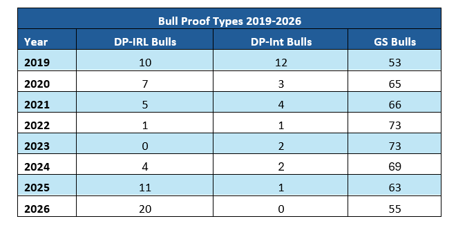 Table 2:  The number of bulls in the various categories of proof types in recent Active Bull lists.
