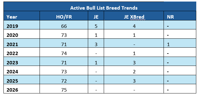 Table 3:  The number of bulls by breed in recent Active Bull lists