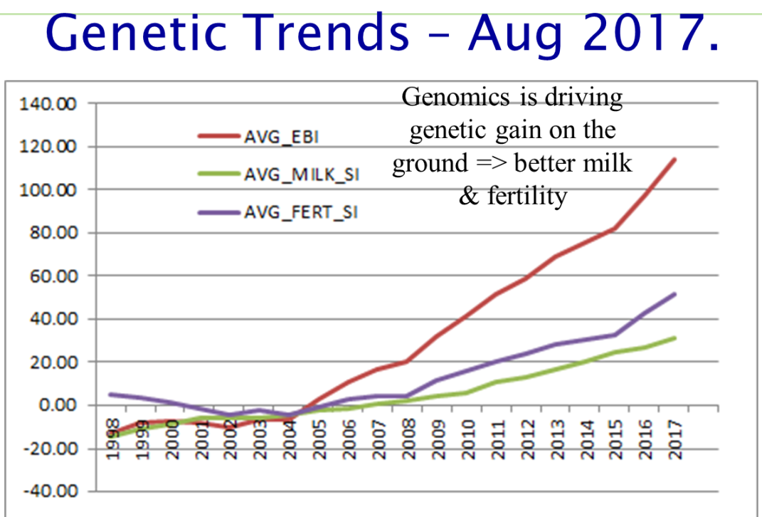 Genomics is continuing to drive genetic gain on the ground. As can be seen from the table below we are seeing continued accelerated progress since 2008 when genomics was introduced. This is resulting in better milk & fertility on the ground