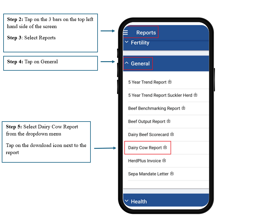 To view the Dairy Cow report on the HerdPlus App: