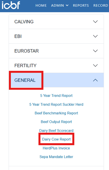 Step 2: Click on General and from the dropdown menu select Dairy Cow Report: