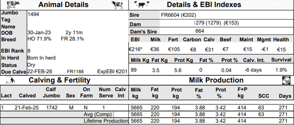 Stay fully informed on your herd’s performance with the Dairy Cow Report available on ICBF. This report gives HerdPlus members a clear overview of milk yield, ancestry, fertility, and key management indicators. Having this information available can help you make confident, data‑driven decisions ahead of the calving and breeding seasons.