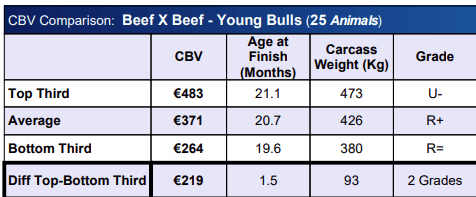 Finishing performance data further supports the relevance of CBV within the system. Among young bulls, the top third for CBV averaged €483, slaughtering at an average carcass weight of 473 kg at just over 21 months of age, with U‑ conformation. In comparison, the bottom third averaged €264 CBV, highlighting the impact that genetic potential, supported by effective management, can have on lifetime performance.
