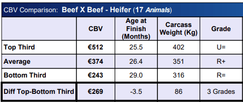 Similar trends were evident in heifers, where the top third achieved an average CBV of €512, compared to €243 for the bottom third, alongside heavier carcasses and higher lifetime €/day performance. All cattle are processed through Foyle Foods, with both breeding and finishing decisions closely aligned to factory specifications.