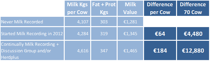 Table 1 above compares herds that never milk recorded with Herds that started milk recording in 2012 and herds continually milk recording, in a discussion group and/or HerdPlus. The research shows that in the average 70 cow herd, the extra output equates to over €12,000 due to increased milk volume and more milk solids.
