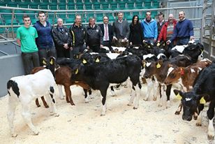 Pictured with the high EBI heifer calves sold at the ICBF / Bottom Line discussion Group Charity Auction in Corrin Mart, Fermoy are members of the four benefiting charities with Andrew Cromie, ICBF and members of the Bottom Line Discussion Group.