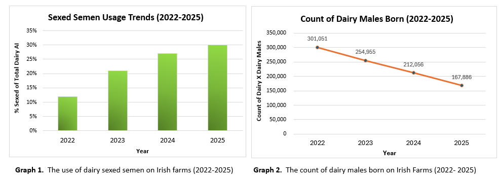 Irish dairy farmers have played a pivotal role in driving genetic progress over the past 25 years. The introduction of the Economic Breeding Index (EBI) and the adoption of genomic technology have helped deliver significant improvements in the milk and fertility performance on Irish farms. However, as breeding practices evolve, new challenges are emerging that require a renewed focus on how we safeguard the future of Irish dairy genetics. One of the most significant changes in recent years has been the increase in the widespread use of sexed semen on dairy farms over the last number of years. It has more than doubled in recent years and this upward trend is expected to continue. This is presented in Graph 1. Over 6,000 herds used sexed semen in 2025, while 30% of the total AI serves on dairy cows have been to sexed semen.