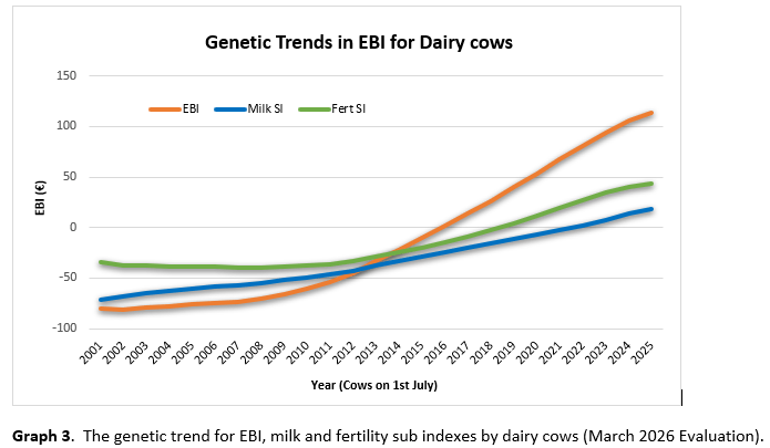 Every year, a minimum number of high-genetic-merit male calves must be born to sustain progress. The cows and heifers identified as among the highest EBI animals nationally play an extremely important role in accelerating genetic gain, not just on individual farms but across the entire industry. By using conventional semen on a select group of your highest genetic merit cows, you help ensure a supply of top genetic bulls for farmers to choose from each year. This simple action supports the profitability and sustainability of the national dairy herd into the future. Graph 3 shows the average EBI and the Milk and Fertility Sub Indexes for dairy cows, highlighting the genetic improvements made in the national herd over the last 25 years. The latest analysis shows the rate of gain for the last 5 years for dairy cows is €12.03/year, based on the March 2026 Evaluation.