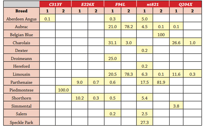 carrying two copies of F94L and >20% of both breeds carrying one copy of F94L. F94L also segregates in the Charolais and Droimeann breeds. The nt821 variant is fixed in the Belgian Blue breed, however, it segregates at lower frequencies in many other breeds, such as Parthenaise, Speckle Park, Shorthorn, Aberdeen Angus, Aubrac and Salers. One copy of Q204X is carried by 26.6% of Charolais, 11.6% of Limousin and 3.8% of Speckle Park purebred cattle.