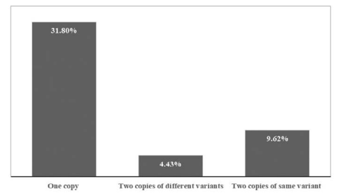 An analysis of 1,123,336 beef purpose cattle with genotypes available for nine myostatin variants (C313Y, D182N, E226X, F94L, L64P, nt821, nt419, Q204X and S105C) indicated that approximately 45.9% of beef cattle carry at least one copy of the myostatin variant. The majority of this group (31.8%) carry just one copy of a myostatin variant, while the remaining 14.1% carry two copies of a myostatin variant, which can be ubdivided into 4.4% carrying two copies of a different myostatin (for example, F94L and Q204X) variant and 9.6% carrying two copies of the same myostatin variant (for example, nt821 and nt821) (Figure 2).