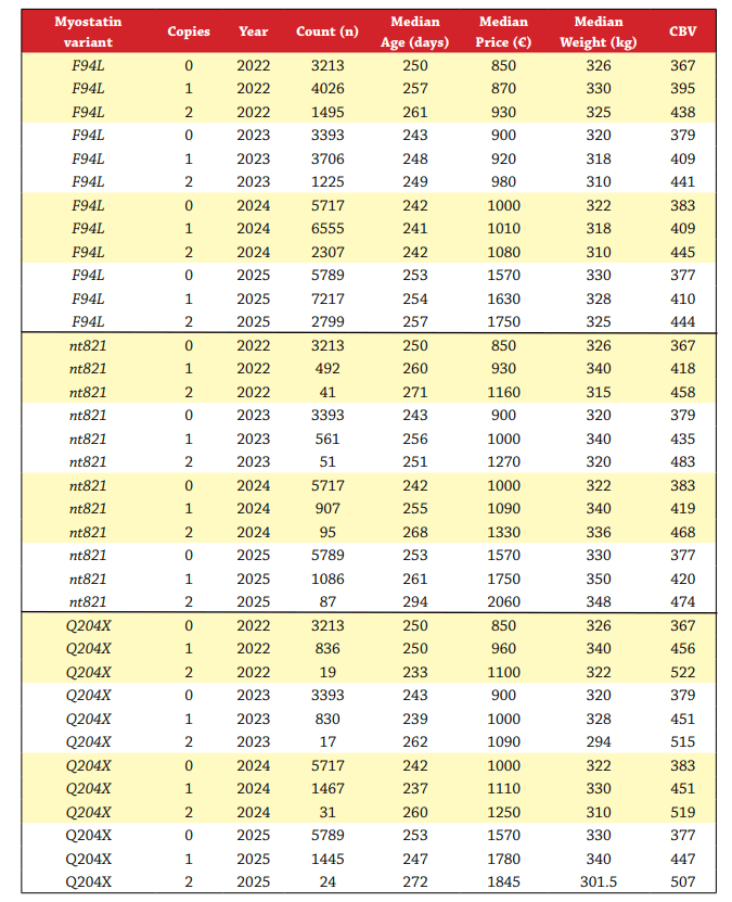 the Q204X variant made, on average, €133 more than those with one copy of the same variant. Trends in commercial beef value (CBV) for these three myostatin variants indicate that the most profitable cattle also have higher CBV values. While these insights are useful, it is important to remember that market value is influenced by many other factors, including breed, management and overall genetic merit. Data for the four years 2022-2025 inclusive is shown in Table 2.