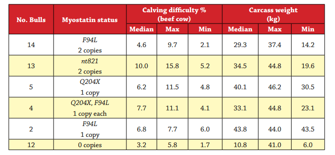 - DNA variations within the myostatin gene (for example F94L, Q204X, nt821) are associated with carcass merit and calving difficulty.