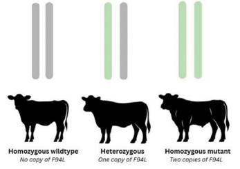 - Homozygous mutant: the animal has inherited a mutated copy of myostatin from both the sire and the dam. For example, an animal inherited the F94L copy of the gene from the dam, and the F94L copy of the gene from the sire.