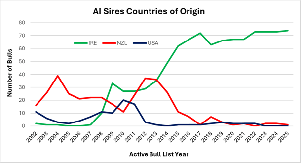 The on-going collection of data is vital for the accuracy of genetic and genomic evaluations for dairy bulls. The information gathered by participating herds will usually form the basis of the first proof for AI bulls. Getting an accurate first proof is essential as these sires can then be used in the genomic training population, further increasing the reliabilities of genomic proofs, as well as being identified as potential sires of the next generation of elite young bulls. Foreign sires dominated the active bull list in the early years. Over time, sires were increasingly sourced domestically. The fact that, today, over 95% of sires tested through the programme are Irish bred, which can be seen in the graph below, is an indication to the success of Dairy Gene Ireland.