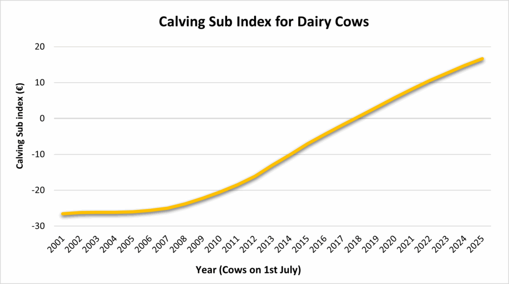 The Calving Sub-Index within the EBI is a critical component for dairy farmers aiming to improve calving ease and reduce mortality rates. This sub-index helps identify bulls that are likely to produce offspring with fewer calving difficulties, which is essential for maintaining herd health and productivity. Gestation length is also a significant factor, as shorter gestation periods can lead to earlier calving seasons and better herd management. The Calving Sub-index has consistently improved year after year, increasing in a linear fashion, with calving difficulty no longer a significant issue. This is shown in graph 2 below.