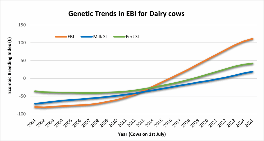 The rate of genetic gain in EBI has accelerated rapidly over the last number of years. The latest analysis carried out shows the current annual trend in the EBI is €11.65/year. To support year on year comparisons between years, the genetic indexes are based on the number of dairy cows on dairy herds on the 1th July each year and are calculated from the September 2025 evaluation. The nationwide increase in genetic gain has obvious benefits, most notably the increased profit per lactation. Every €1 increase in EBI leads to a €2 increase in farm profit.
