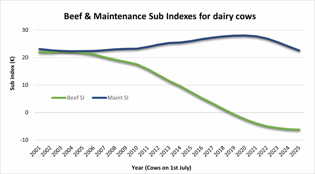 There has been a slight increase in the Maintenance Sub Index, which estimates the cost of growing and maintaining a replacement female in the dairy herd based on her genetic makeup. However, over the last three to four years, this trend has been declining. It appears that the size of cows has started to increase again in recent years, as indicated by genetic data. Regarding the Beef Sub Index, which focuses on the beef production traits of dairy cattle, such as higher carcass weights, there has been a continued decline, although at a slower rate over the last few years. Both of these genetic trends are presented in Graph 3 below.