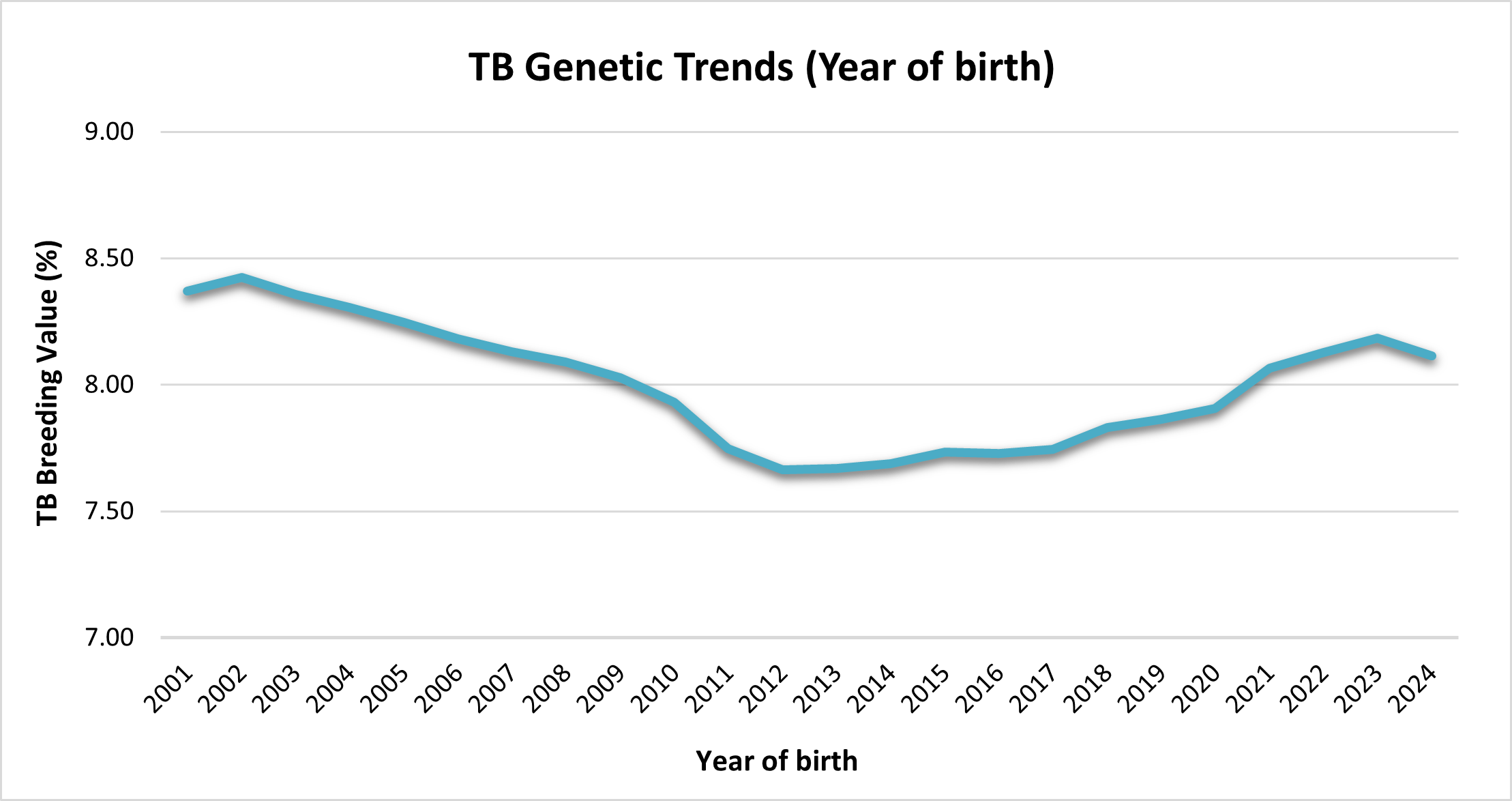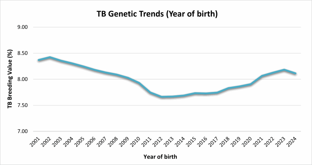 TB breeding values were first published as a standalone trait in 2019. However, it wasn’t until their inclusion in the EBI in November 2022, as part of updates to the Health Sub Index, that farmers began to take real notice. Since then, the trend appears to be stabilising.