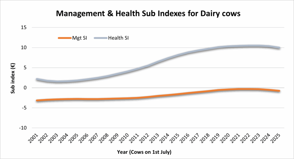 Graph 1. shows the average EBI and the Milk and Fertility Sub Indexes for dairy cows, highlighting the genetic improvements made in the national herd over the last 20 years. Following the introduction of the Gene Ireland programme and genomic selection in 2005 and 2009 respectively, the trends for milk and fertility improved significantly, with both the Milk and Fertility Sub Indexes increasing simultaneously and at an equal rate. Prior to this, the milk production was increasing while fertility was declining. In 2025, the average EBI of dairy cows is €188 higher than it was 20 years ago, translating to an additional €376 per lactation for cows calved this year compared to those in 2002. This genetic improvement has significantly helped farmers breed more efficient and sustainable animal.