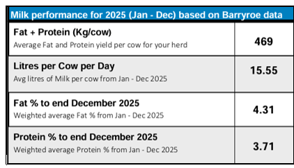 In 2025, the herd averaged 15.55 litres per cow per day, producing 469 kg of fat and protein per cow. These results reflect sound management combined with a strong genetic foundation.