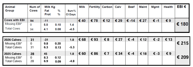Even more impressive are the 2026‑born calves, which have an average EBI of €215, well ahead of the national average of €173. By identifying the best animals earlier, genomics allows Dermot to accelerate genetic gain year on year.