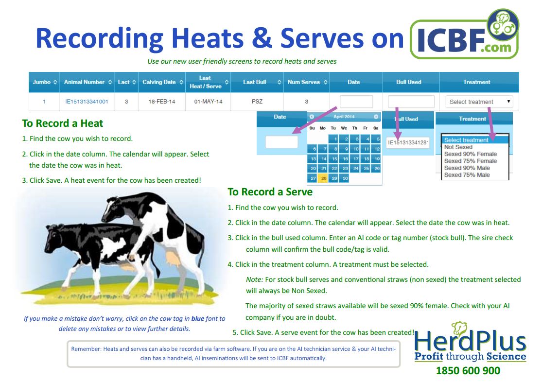 To ensure that expected calving dates are included in the 2018 Dairy HerdPlus Pocket Notebook all serves should be recorded on the ICBF database. Pregnancy scanning data should also be recorded where completed. Data must be recorded in the ICBF database by 31st October in order to guarantee that this data is printed on your pocket notebook and expected calving list.